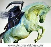 Revelation 6:7 - When He opened the fourth seal, I heard the voice of the fourth living creature saying, "Come and see."Click here for commentary on the four living creatures. The fourth living creature beckons John come and see what judgment the Lord is sending on the earth with the breaking of the fourth seal. Revelation 6:8 - So I looked, and behold, a pale horse.![]() John describes the last horse as "chloros," which is the Greek word for green. The same word is found in Mark 6:39, Revelation 8:7, and Revelation 9:4, to describe the color of grass and plants. Green has a large color spectrum. A horse the color of green grass does not seem to fit the context of this horse being connected with death, as shown in the next section, which is probably why most translators call it a "pale" horse, being a greenish-yellow color. ![]() Recall from Zechariah 6:3, it is probable the pale horse is the same kind as those described by Zechariah as sorrel, spotted, speckled, dappled, mottled, or grisled. John's focus is on the color of the horse, while Zechariah's focus is on the pattern of the horses. The horse to the right fits the descriptions given by both John and Zechariah: Revelation 6:8 - And the name of him who sat on it was Death, and Hades followed with him.The rider on the pale horse has the name "Death." We often see this rider pictured as the "Grim Reaper," a skeleton figure cloaked in black, carrying a large sickle. The "Grim Reaper" is prevalent in pop culture, having origins in mythology and paganism. Even so, "Death" appears as a real entity, as John describes him as the rider on the pale horse and Zechariah describes the riders of the horses as "spirits of Heaven" (Zechariah 6:5). We find "Death" and "the grave" together in Scripture when referring to the physical death of the body: Psalms 49:14 - Like sheep they are laid in the grave; Death shall feed on them; the upright shall have dominion over them in the morning; and their beauty shall be consumed in the grave, far from their dwelling. Hades is the place for the souls in the heart of the earth: Matthew 12:40 - For as Jonah was three days and three nights in the belly of the great fish, so will the Son of Man be three days and three nights in the heart of the earth. Acts 2:31 - ...concerning the resurrection of the Christ, that His soul was not left in Hades, nor did His flesh see corruption. "Sheol" is Hebrew for "Hades" in the Greek. Isaiah personifies Shoel, or Hades: Isaiah 38:18 - For Sheol cannot thank You, Death cannot praise You; those who go down to the pit cannot hope for Your truth. These spiritual entities, together, show that judgment in the form of death is coming to the earth. During the Tribulation, those who are believers do not go to Hades, but to Heaven (Revelation 6:9-11, Revelation 7:9-15). We see that this judgment of death is on unbelievers because Hades is following Death, which is where lost souls go to await final judgment, before the second death in the lake of fire: Revelation 20:13-14 - The sea gave up the dead who were in it, and Death and Hades delivered up the dead who were in them. And they were judged, each one according to his works. Then Death and Hades were cast into the lake of fire. This is the second death. Recall from Revelation 1:18, Jesus has the keys of Death and Hades, which represents His power to release believers from their bondage because He paid the penalty for death: 1 Corinthians 15:54-57 - So when this corruptible has put on incorruption, and this mortal has put on immortality, then shall be brought to pass the saying that is written: "Death is swallowed up in victory." "O Death, where is your sting? O Hades, where is your victory?" The sting of death is sin, and the strength of sin is the law. But thanks be to God, who gives us the victory through our Lord Jesus Christ. Revelation 6:8 - And power was given to them over a fourth of the earth, to kill with sword, with hunger, with death, and by the beasts of the earth.The scope of the white, red, and black horse is global. The pale horse has power to judge a fourth of the earth with the four severe judgments of God. We find these four judgments elsewhere in Scripture as follows: