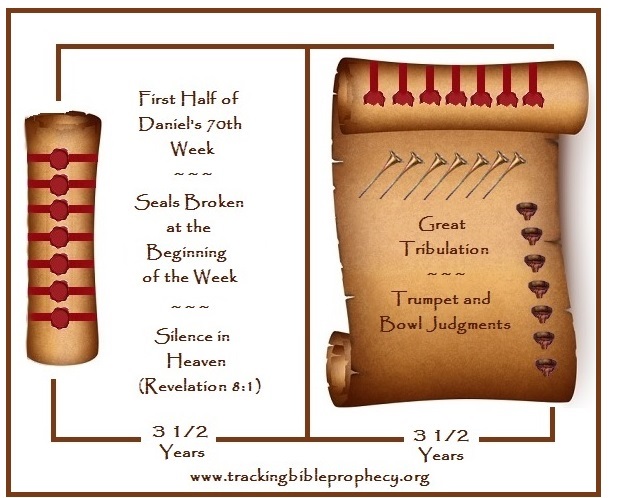 Revelation 6:1-8 Revelation 6 - Quick Links Introduction to the Seal Judgments In Revelation 5, we saw that the sealed scroll the Lamb takes from the right hand of God is the "purchase deed" to the the earth. Jesus is the Kinsman Redeemer, being the only one worthy to open the sealed scroll and reclaim the earth. Subsequent chapters in Revelation show that the contents within the "purchase deed" are judgments which must come to pass on the earth before the Lord returns. These judgments are to prepare for the Lord's earthly reign in two ways: To evict the rebellious inhabitants from the earth, and turn the Jewish people back to God. God has determined that twenty-one judgments will occur after Jesus takes the sealed scroll. The sealed "purchase deed" to the earth includes all twenty-one judgments, divided into three groups: Seals, Trumpets, and Bowls. The last Seal judgment includes the seven Trumpet judgments. The last Trumpet judgment includes the seven Bowl Judgments. Jesus breaks the Seal judgments at the beginning of the Tribulation, followed by a "half hour of silence" (Revelation 8:1) of the "hour of trial" (Revelation 3:10 ). Silence from God shows His refrain from judgment (Psalms 50, 83, 109). Therefore, a "half hour of silence" in Heaven shows there are no judgments from God for about half the Tribulation period. (Click here for more on the "half hour of silence"). After this "half hour of silence," the rest of the judgments from Heaven occur over the second half of the Tribulation, in what Jesus calls "great tribulation" (Matthew 24:21): ![]() There are seven Seal judgments. "Seven" is the number of perfection or fullness: "In the Hebrew, 7 is shevah. It is from the root savah, to be full or satisfied, have enough of. Hence the meaning of the word "seven" is dominated by this root, for on the seventh day God rested from the work of Creation. It was full and complete, and good and perfect. Nothing could be added to it or taken from it without marring it. Hence the word Shavath, to cease, desist, rest, and Shabbath, Sabbath, or day of rest...." "Another meaning of the root Shavagh is to swear, or make an oath. It is clear from its first occurrence in Genesis 21:31, "They sware both of them," that this oath was based upon the "seven ewe lambs" (verses 28-30), which point to the idea of satisfaction or fullness in an oath. It was the security, satisfaction, and fullness of the obligation, or completeness of the bond, which caused the same word to be used for both the number seven and an oath; and hence it is written, "an oath for confirmation is an end of all strife." Beer-sheba, the well of the oath, is the standing witness of the spiritual perfection of the number 7." Source: BibleStudy.org The Lord's feasts, sabbaths, and jubilees are replete with the number "seven": ![]() We also find the number "seven" in how long the Lord said He would punish Israel for their sins: Leviticus 26:18, 21, 23-24, 27-28 - And after all this, if you do not obey Me, then I will punish you seven times more for your sins.... Then, if you walk contrary to Me, and are not willing to obey Me, I will bring on you seven times more plagues, according to your sins.... And if by these things you are not reformed by Me, but walk contrary to Me, then I also will walk contrary to you, and I will punish you yet seven times for your sins.... And after all this, if you do not obey Me, but walk contrary to Me, then I also will walk contrary to you in fury; and I, even I, will chastise you seven times for your sins. The Tribulation, or "Daniel's 70th Week," begins when Israel and the antichrist confirm a covenant (Daniel 9:27). God gave Israel 70 "weeks" in which He would punish their transgressing of the Law before the Messiah would come to rule: Daniel 9:24 - "Seventy weeks are determined for your people and for your holy city, to finish the transgression, to make an end of sins, to make reconciliation for iniquity, to bring in everlasting righteousness, to seal up vision and prophecy, and to anoint the Most Holy." History has shown us that the 70 weeks are 70 "weeks" of years, or 490 years. There were 483 years from the command to Nehemiah to restore and build Jerusalem after Israel's exile until Jesus died, being "cut off" (Daniel 9:26). During those 483 years, God punished Israel under the yoke of Gentile rule. After the cross, God turned away from Israel because they rejected His Son (Romans 11). There are seven years left of the 70 "weeks" of punishment. Today we live in the gap between the 483 years and the last seven years. During these last seven years, God will turn back to Israel. However, God will punish Israel along with His enemies through the judgments recorded in the "purchase deed" of the earth. In the last seven years, three groups of seven judgments will complete or fulfill the 70 weeks of Gentile rule and punishment determined by God in Daniel 9. "Three" is the number of completion: "Two straight lines cannot possibly enclose any space, or form a plane figure; neither can two plan surfaces form a solid. Three lines are necessary to form a plane figure; and 3 dimensions of length, breadth, and height, are necessary to form a solid. Hence the number is the symbol of the cube -- the simplest form of solid figure. As two is the symbol of the square, or plane contents (x*x), so three is the symbol of the cube, or solid contents (x*x*x)." "Three, therefore, stands for that which is solid, real, substantial, complete, and entire. All things that are specially complete are stamped with this number...."